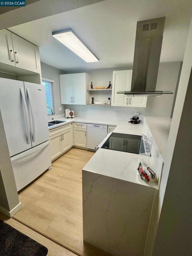 Wonderfully renovated Bay Farm Island townhome featuring 2 large bedrooms and 1.5 baths. The completely new kitchen has an open design with quartz counters, a waterfall edge, and new appliances. The primary Bathroom is fully updated with a new vanity, tiled shower and floors, and lighting. The open design main floor features a fireplace and hardwood floors. The living area opens to a fully landscaped private courtyard and access to the two-car garage. Dual paned windows are throughout the home. Ideally situated to SF ferry, Harbor Landed Shopping Center, Open space & the Bay. HOA amenities include a clubhouse, 2 pools, a playground, greenbelt, guest parking.
