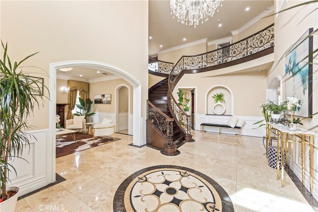 Welcome to this timeless Georgian Colonial?style estate. Built in 2008, this elegant residence offers 6 bedrooms, 6.5 bathrooms, and a detached 3-car garage. The breathtaking grand foyer is highlighted by a dramatic chandelier, a beautifully stenciled dome, and soaring 26ft ceilings. The main level is thoughtfully designed for both everyday living and sophisticated entertaining. There is a refined library with custom cabinetry and fireplace, living room with another cozy fireplace, family room, formal dining room and a primary suite. The gourmet kitchen is a chefs dream, featuring a large marble center island, high end appliances, double ovens, warming drawers, and a separate wok kitchen. The adjoining family room is warm and inviting, complete with custom built-ins, a central AV console, and a full wine bar. Upstairs, the luxurious primary suite offers a private sanctuary, a spa-inspired bathroom with a steam shower, spacious walk-in closet, and a custom vanity. A unique highlight is the offices with a balcony overlooking the stunning San Gabriel Mountains. Additional bedrooms include a junior suite, two full-size bedrooms with a shared bath, and a generous den. The lower level basement is designed for ultimate entertainment and flexibility. It features a dance studio, entertainment/ game room, bar, and a private suite with marble steam shower, custom cabinetry, and its own exterior access. (Perfect for multi-generational living.) The beautifully landscaped backyard offers a resort-like setting with a waterfall and over 20 fruit trees. Located within the prestigious Arcadia School District, this exceptional home delivers luxury living in one of Southern Californias most desirable communities.