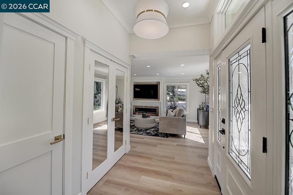 Rarely available redesigned Golden Gate in Rossmoor. This level-in end unit has been thoughtfully remodeled with custom craftsmanship and high-end finishes throughout. The bright living room features two added windows, a rare upgrade not standard in the model, bringing in exceptional natural light and enhancing the open feel of the space. The designer kitchen showcases custom American-made cabinetry with convenient pull-outs, quartz countertops, sleek appliances, and a built-in wine refrigerator. Both bedrooms include custom closet inserts, and the two spa-inspired bathrooms feature high-end bidet toilets. Additional upgrades include luxury vinyl plank flooring, recessed lighting throughout, updated plumbing and electrical, dual-pane windows, a built-in electric fireplace, 65-inch TV, new washer and dryer, and a brand new HVAC split system. Enjoy a private atrium with custom lighting, perfect for relaxing or entertaining. Convenient street parking is available along Tice Creek.