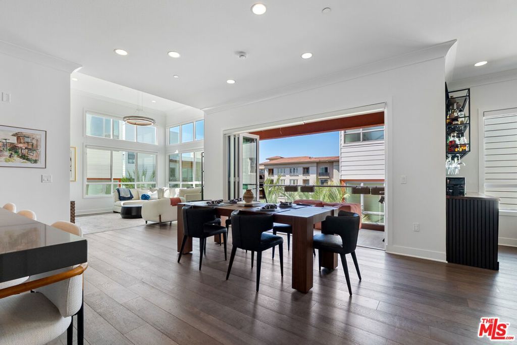 Stunning single-level Skylar penthouse featuring soaring ceilings and an expansive open floor plan. Step inside to an abundance of natural light, highlighted by gorgeous wide plank hardwood flooring throughout. The chef's kitchen is beautifully appointed with top-of-the-line stainless steel Thermador appliances, an oversized center island with striking pendant lighting, marble backsplash, and a walk-in pantry. The kitchen flows effortlessly into the dining area, where accordion doors open to an oversized patio, creating a seamless indoor-outdoor living experience. Just beyond the dining space is a spacious living room with dramatic high ceilings and large windows that flood the home with light. Retreat to the luxurious primary suite featuring two walk-in closets and a contemporary bathroom complete with an elegant glass barn door, soaking tub, glass enclosed shower, and dual sink vanity. On the opposite side of the home are two generously proportioned bedrooms, one featuring a custom Murphy bed, connected by a modern Jack and Jill bathroom. Additional amenities include a fully renovated powder room, a custom built-in bar with a wine fridge, a generous laundry room with a new washer and dryer, a private two car garage with built-in storage and an EV charger, solar panels, and exceptional privacy as the only residence on the top floor. Enjoy the best of Playa Vista living at Osprey Ln, just moments from shops, dining, parks, and everything this vibrant community has to offer.