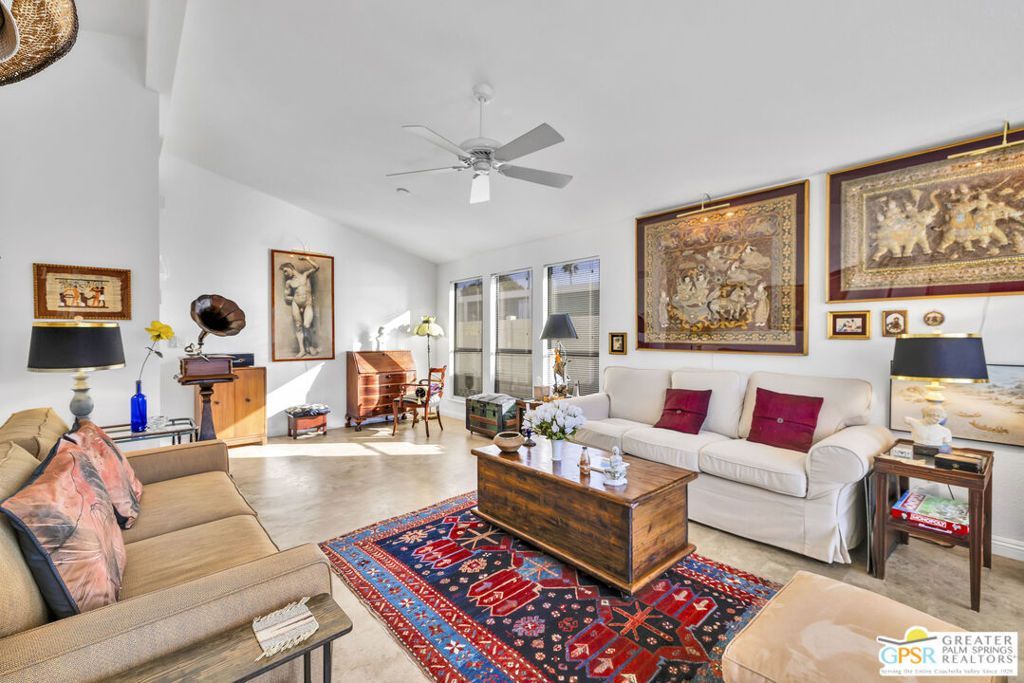 BACK ON THE MARKET: Location + Garage + Solar = A fantastic opportunity at The Canyon, one of the area's most desirable mobile home communities. This spacious 2 Bed / 2 Bath home with a bonus sunroom offers 1,558 sq. ft. of comfortable, well-maintained living space. With drywall throughout, recent updates include: new water heater, garage door, and garage insulation (2024) - new kitchen appliances; gas range, refrigerator, microwave, and dishwasher (2020) - new AC coil and furnace (2021) - new AC/heater mini-split in sunroom, new electrical panel, and patio misting system (2019). From the cozy living room, take in the mountain views and gorgeous desert sunsets. The kitchen features granite tile countertops and custom cabinetry. The large primary bedroom with ensuite bath creates a private retreat within the home. The primary and guest baths both offer granite countertops and custom cabinetry, with the primary bath featuring dual sinks. The bonus sunroom offers versatile possibilities and features a gas fireplace. Energy efficiency is a highlight with 20 leased solar panels installed in 2020 by Sunrun, and a vented evaporative cooler, helping keep energy bills low. Enjoy the convenience of the laundry room adjacent to the attached two-car garage. Outside, the private, fenced backyard includes an electric patio awning and two mature citrus trees. Community amenities at The Canyon include two sparkling heated pools and spas, tennis & pickleball courts, a welcoming clubhouse with library/card room, billiard/game room, fitness room, crafts room, indoor shuffleboard, and a beautiful multi-function room with a stage and professional-style kitchen, ideal for events. This home is conveniently located on a quiet street, just one block away from the clubhouse. The Canyon is a gated, well-maintained 55+ community. Buyers must obtain park approval, which requires a minimum 750 credit score and proof of income three times the monthly space rent of $995. One pet up to 20 lbs is permitted. Buyers and their agents to verify current space rent and square footage. With PSP Airport, shopping, and restaurants just minutes away, this home is perfect for year-round living or as a vacation retreat.