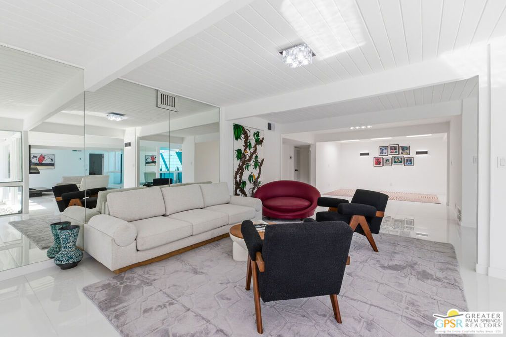 Smashing! Mid Century at its finest. Huge (3743 square foot) amazing home. Built in 1956, it features the most quintessential elements of Mid Century Modern Architecture; post and beam construction, tongue and groove ceilings, walls of glass allowing pool and mountain views, 4 beds, 4 ensuite baths, kitchen, living room, fireplace, dining room, bar, office, breakfast room. Newly and beautifully refurbished. The seller has made every attempt to retain as much of the original features as possible e.g. original bathroom tile and sourcing period Kohler low boy toilets from the 1960s. Home is located in Deepwell one of the most desired areas in all of Palm Springs. Deepwell, a private, non windy enclave, close to all amenities without the hustle and bustle. It has long been the home to celebrities and movie stars and generally features elegant homes with manicured lawns on large lots. Property is huge and perfect as single family home, can be used for family gatherings, parties and can also be rented short or long term. Similar size house in the area earned over $100,000 in rental income in 2025. There are still permits available as of this writing but check with city of Palm Springs for current status re short term permits. This lovely residence is alleged to be the former home of a Radio City Rockette built for her by a generous indulgent boyfriend. The perfect place for the new owner to kick up his/her heels! Property is exquisitely furnished and decorated featuring classic modern furnishings and artwork with pieces by Jonathan Adler, Kartell, Milo Baughman, Jens Rison, Ernst Moeckle, Gitzberg, Gruen, Howard, Reggiani, Miro, Sciolari, Murano, Risley and Tretchikoff.