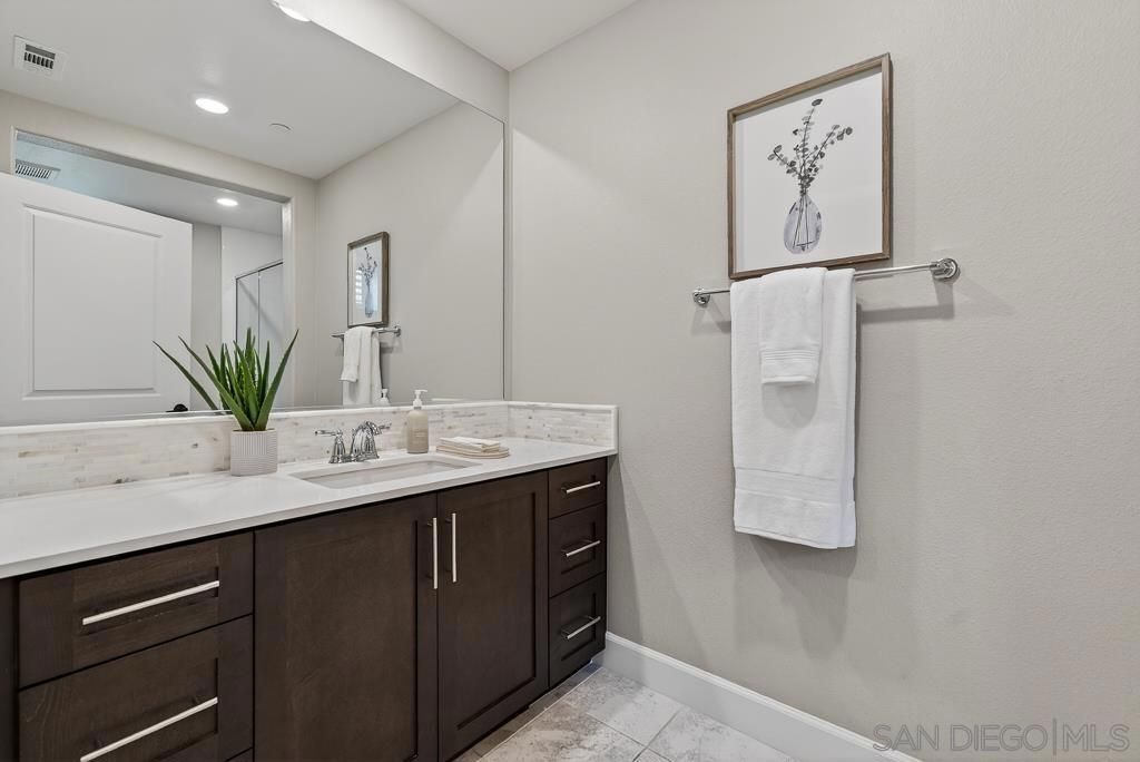 AVANTE IS A 55+ COMMUNITY. Elevated modern living meets comfort and convenience in this 3 bd/3 ba home in the heart of Del Sur! ONLY AVANTE FLOOR PLAN WITH A FULL BEDROOM & BATHROOM DOWNSTAIRS - ideal for guests, a caretaker or home office. Enjoy 1,688 sq. ft. of rich finishes, natural light, and designer touches. Take the stairs or your own private in-home elevator to the bright, open concept main level. The kitchen showcases Denali White quartz countertops, smoke-toned shaker cabinetry with sleek chrome... pulls, a modern linear mosaic backsplash, glass display cabinets, European soft-close drawers, and a stainless steel G.E. appliances. Under-cabinet lighting and clean, contemporary finishes create a refined, functional space. Enjoy a morning coffee and relaxing evening on your private southeast-facing balcony. The spacious primary suite features crown molding, a custom built-in walk-in closet, and a spa-inspired bathroom with a designer linear mosaic backsplash & quartz countertops. Bathrooms include Arizona Denali quartz counters, modern fixtures, and Esmer tile shower surrounds. Additional highlights include wood shutters, motorized privacy shades, and an epoxied garage floor. Smart home features include a Ring doorbell, Honeywell smart thermostats, enhanced WiFi connectivity, & smart lighting. Enjoy access to the Avante clubhouse, pool & spa, fire pit, BBQ areas, and events. Located within the award-winning Del Sur community with access to parks, pools, and scenic trails?all just a short walk to Del Sur Town Center. A rare opportunity to own a truly turn-key, lock & leave home in one of North Countys most sought-after 55+ communities!