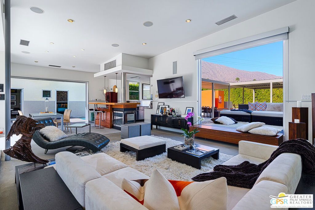 AVAILABLE March 16, 2026 to Dec 31, 2026, and starting April 1, 2027. Seasonal Rental. This unique Palm Springs modem compound is in the popular Twin Palms Estates neighborhood. The walled and gated property features multiple structures and outdoor spaces, resort-style amenities, and architectural design reminiscent of the iconic Alexander butterfly mid-century modern homes. This Palm Springs home truly speaks to the Art of Desert Living, has been cited and featured in a variety of magazines worldwide and won Home of The Year in Metropolitan Home. The art of desert living is best exemplified in a property's outdoor amenities, and this property doesn't disappoint. Amenities include a 60 ft saltwater pool, large saltwater spa, outdoor kitchen, outdoor bed, 4 fire-pits, 2 outdoor showers and more. There is about 2,000 sqft of interior space spread out over 3 buildings. The main house consists of a living room, dining room and kitchen. All rooms have concrete floors and large sliding glass doors, that when opened, blur the line between indoor and outdoor spaces. The living room features a wall mounted TV plus a large seating area with L-shaped sofa, ottoman and 2 comfortable chairs. A large sliding glass door connects the living room to an outdoor bed with pool and mountain view. Next to the Dining room is the kitchen. The two rooms are separated by a breakfast bar with a built-in fireplace. The kitchen itself has a modem and commercial vibe and features high quality appliances including large stove top with grill, oven, wine refrigerator, refrigerator freezer and dishwasher. The adjacent dining room seats six and has two over-sized sliding glass doors. One of the doors opens to a wood bridge that spans the pool to secondary ensuite bedroom and the other door opens to an outdoor dining room, distinctive firepit seating area and a detached structure solely for the primary bedroom and bathroom. The Primary Bedroom is a stand-alone structure just steps away from the main house. Like the main house it has concrete floors and a large sliding glass door, that when opened, blur the line between your bedroom and the outside. Inside you'll find a King size bed, spacious closet, Smart TV and gas fireplace that separate the bedroom from the master bathroom. On the bathroom side, the fireplace is perfectly situated next to the large bathtub. Who needs candles when you can soak beside the flames of a roaring fireplace? There is also a large shower with waterfall shower head, two large sinks, a clerestory window and a door that opens to a private outdoor shower. The Guest bedroom/den structure features a guest bedroom with queen size bed and Smart TV. A bathroom connects it to the guest living room that features a couch that can sleep one, and another Smart TV. The main purpose of this Palm Springs modern compound is rest, rejuvenation, and fun. Flanking the 60 ft saltwater pool, lounge chairs and large outdoor bed float above the water while the outdoor kitche