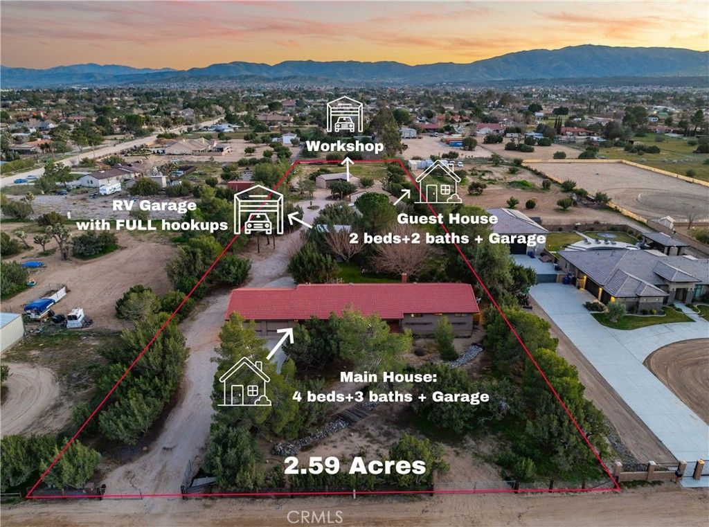A truly exceptional and one-of-a-kind property featuring two separate residences on 2.5 beautifully maintained acres. Thoughtfully designed and meticulously cared for by the original owners. Featuring covered RV parking with hook-ups and separate , huge workshop with mechanic's style pit. This rare offering provides versatility, privacy, and endless possibilities for multi-generational living, rental income, or work-from-home lifestyles. The front residence, approximately 2,400 sq ft, offers 4 bedrooms, 3 bathrooms, and an oversized attached two-car garage. Inside, you'll find elegant formal living and dining rooms with vaulted ceilings, creating a bright and welcoming atmosphere. The spacious family room with a Blaze King stove adds warmth and charm, while the kitchen features custom cabinetry and granite countertops, ideal for everyday living and entertaining. Pride of ownership is evident throughout this impeccably maintained home. The second residence, approximately 1,500 sq ft, includes 2 bedrooms, 2 bathrooms, and an attached oversized two-car garage (32' x 25'). This home features a kitchen with granite countertops and a center island, formal living and dining areas, a cozy wood-burning stove in the family room, private laundry, and two generously sized bedrooms with expansive bathrooms, offering comfort and independence. The grounds are equally impressive with a meticulously designed desertscape front yard and a lush, beautifully landscaped rear yard ideal for entertaining. Property is fenced and crossed fenced, including automatic gate entry. And offers several working sheds in addition to the huge workshop and covered RV. This home is a once in a lifetime opportunity.