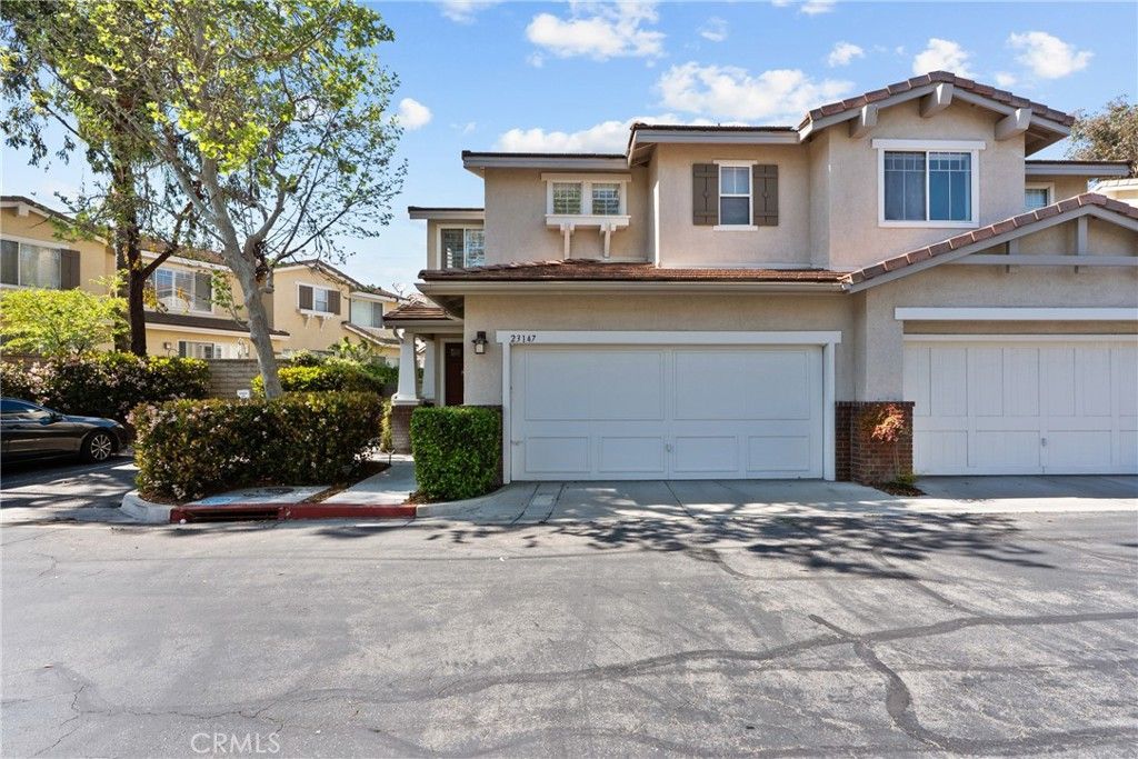 Welcome to this much sought after townhouse complex in Valencia. A lovely end unit 2 bedroom 2.5 bath in the desirable Cheyanne community. This Wonderful floor plan has a light and bright living room with stone fireplace for cozy gatherings. The kitchen over looks the quartz breakfast bar for easy entertaining. Ample counter space and cabinets galore ! Newer dishwasher and farm sink for swift clean up !The downstairs living area has newer laminate floors for easy care and a half bath for guests. Upstairs you'll find The primary suite has plantations shutters, ceiling fan and appealing bath/dressing area. A walk in closet is an added bonus! The en suite second bedroom with full bathroom , ceiling fan and plenty of light. The backyard as Impressive space...lots of greenery and big patio area ~ side are for pets with well drain turf . 2 car attached direct access garage ~ NEW AC unit and garage door opener and new Nest thermostat. Lower HOA dues, no mello roos and a fantastic community amenities including pool, spa, picnic area, tot lot and security patrol Conveniently located near top rated schools, parks and Bridgeport market place for shopping. Don't miss the fantastic opportunity to call Valencia Home !
