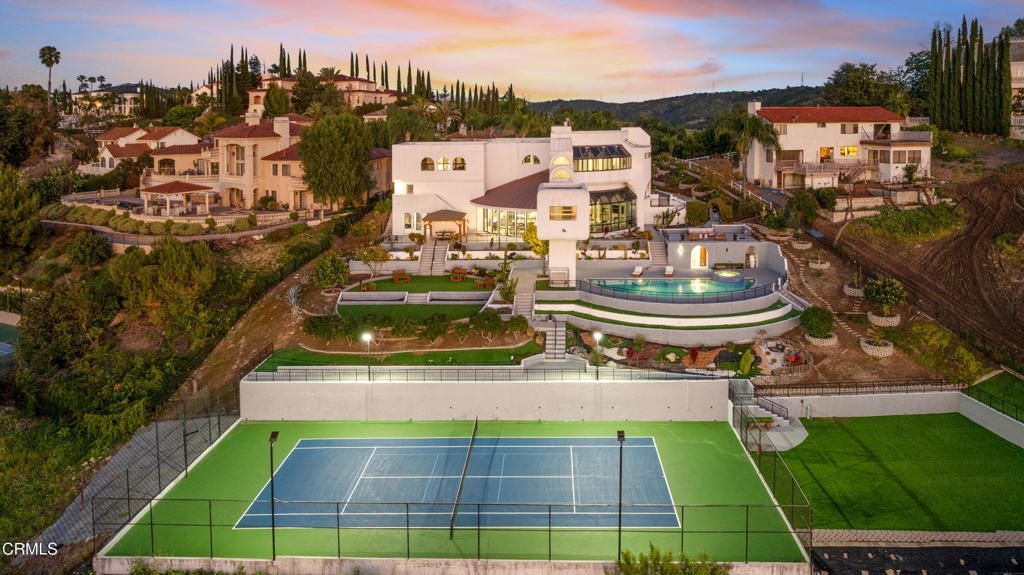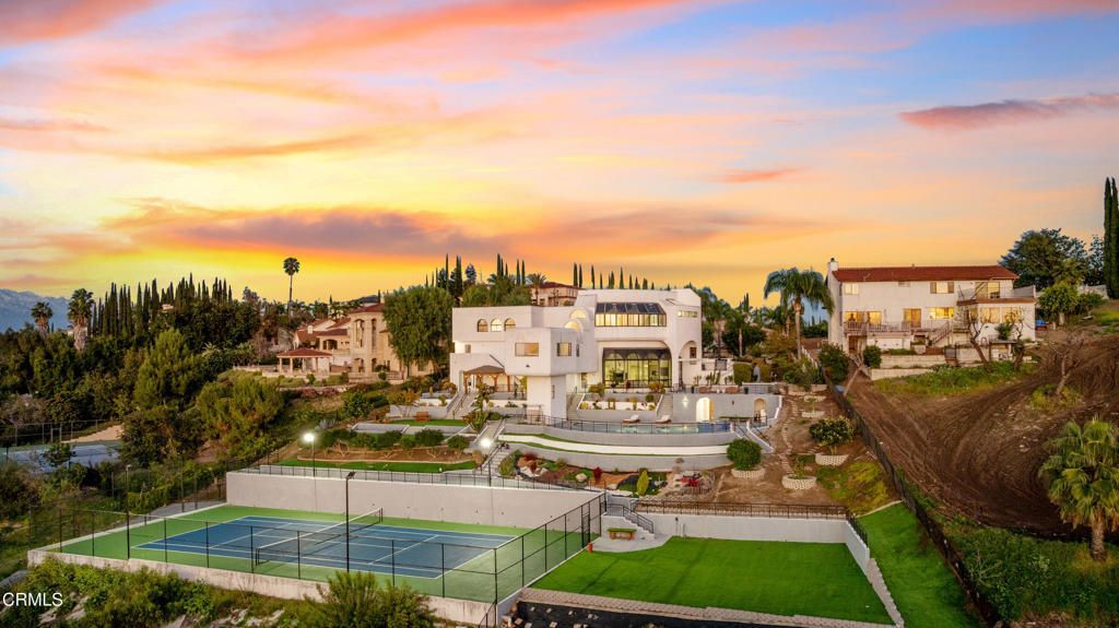 Modern Art Deco Revival Estate in The Country EstatesA rare architectural statement within the prestigious 24-hour guard-gated Country Estates, this Modern Art Deco Revival estate commands a private, resort-caliber setting with sweeping panoramic city-light and mountain views.Set behind a grand approach, the residence blends sculptural geometry with refined Contemporary symmetry, offering a lifestyle designed for both elevated entertaining and serene everyday living.The grounds unfold as a true private resort: a full-size tennis court, elevated pool and spa terrace curves along the landscape with sweeping views, putting green, gazebo, viewing deck, and curated gardens framed by mature fruit trees, including orange, guava, kumquat, tangerine, apple, dragonfruit, and rare Leon avocado. Every element has been thoughtfully positioned to maximize privacy and panoramic vistas.Dramatically extending from the upper level, an expansive viewing and meditation tower unfolds as a light-filled architectural aerie designed as a sanctuary above it all. Framed by sweeping panoramic vistas, the elevated pavilion offers a rare vantage point for sunrise rituals, sunset reflection, and stargazing under open skies.Inside, soaring ceilings, distinguished archways, expansive walls of glass create a luminous interplay of light and space. Floor-to-ceiling windows invite the outdoors in, while an expansive floor plan offers seven bedrooms, multiple grand-scale living areas, and a private executive office with its own entrance.The chef's kitchen is appointed w/ Sub-Zero refrigeration, professional-grade appliances, custom cabinetry, & an oversized island designed for gathering.The primary suite serves as a tranquil retreat, featuring spa-inspired amenities, a soaking tub, walk-in shower, bidet, & private lounge area. Six additional bedrooms provide generous accommodations for family and guests. Reinforced security glass & carefully selected finishes reflect a commitment to both elegance & peace of mind.Enhancing the resort experience is a detached wellness retreat, complete w/ sauna, dedicated shower suite, & private water closet, delivering spa-level amenities just steps from the pool terrace.Residents of The Country enjoy 24-hour security, clubhouse, equestrian trails, parks, playgrounds, & award-winning Walnut Valley schools.This is more than a residence, it's a legacy estate defined by architectural presence, privacy, & the highest standard of SoCal living.