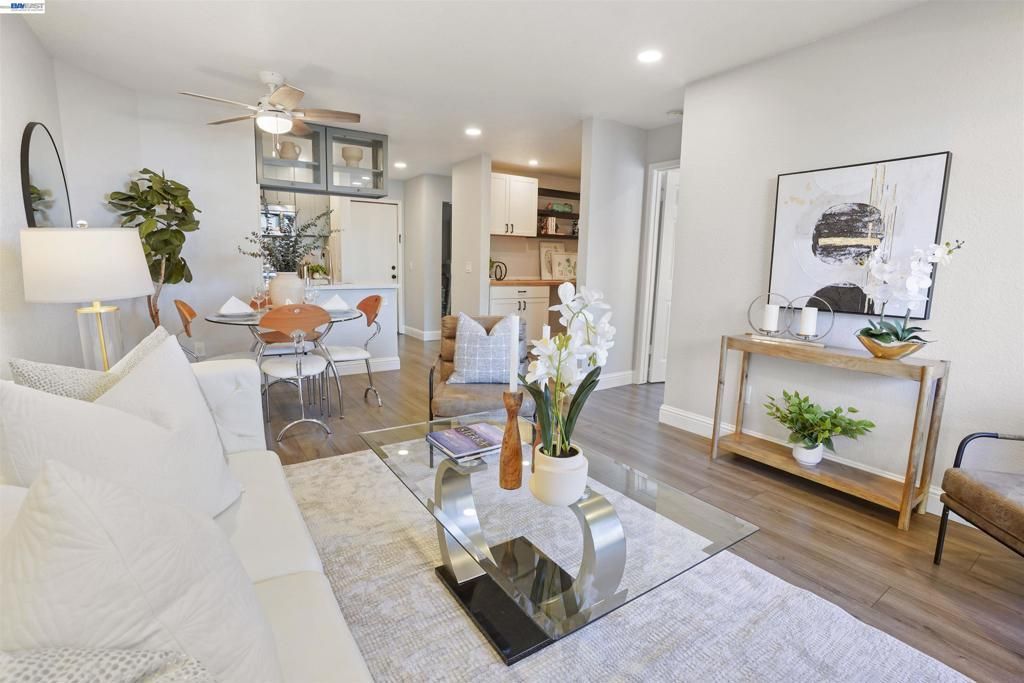 Welcome to this beautifully updated one-bedroom, one-bathroom condo with BONUS space, located in a gated community offering both security and convenience. This home features a modern, open layout with fresh paint and laminate flooring throughout. The updated kitchen includes sleek cabinetry, stainless steel appliances, and quartz countertops, making it as functional as it is stylish. A spacious living area is filled with natural light thanks to a west-facing sliding glass door that leads to a private deck, perfect for enjoying the afternoon sun. Just off the main living space is a versatile bonus area, ideal for a home office or a cozy second sitting room. The bedroom is well-sized, and the bathroom is tastefully finished for a clean, modern feel. Enjoy the convenience of an in-unit washer and dryer along with a dedicated covered parking spot. This home is ideally situated near the BART station, shopping, grocery stores and the golf course, with easy freeway access for commuters. With thoughtful updates and a bright, welcoming atmosphere, this condo is move-in ready and a perfect place to call home.