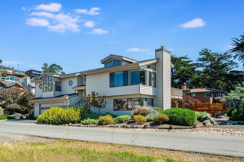 Nestled on a corner lot on the Marine Terrace, this substantial home offers an incredible spacious living experience. The home boasts light-filled rooms with vaulted ceilings and numerous view windows creating a flowing open floor plan with ocean views. The 120 foot long estate size lot allows for generous room sizes, while still allowing for outdoor gardens and patios. The living areas are located on the second floor to take advantage of the ocean views. These include the kitchen, living and dining rooms, primary suite, half bathroom and two decks. The open kitchen has a pantry, oven plus separate cooktop and an eating bar with space for 6 barstools. The deck off the dining room is the perfect spot for the bbq. There is a gas log fireplace in the living room to cozy up to at night. Convenient to everyday living, the primary bedroom is on the same level as the main living areas. It has an ocean view, sitting area, vaulted ceilings, two closets (one is a walk-in) and access to the back deck overlooking the garden. Downstairs are two more bedrooms, large laundry room including sink, a full bathroom and quite a few closets. The oversized two car garage allows room for your cars, bikes and kayaks so you can enjoy this incredible beach town of Cambria. The yard surrounding the home is filled with poured concrete aggregate patios and plants, ready for your enjoyment. There is an additional off-street parking area on the west side of the home for a small RV or boat. You cant beat this location on the Marine Terrace. There are no hills to climb to access the beach or the nearby Fiscalini Ranch boardwalk and trails.