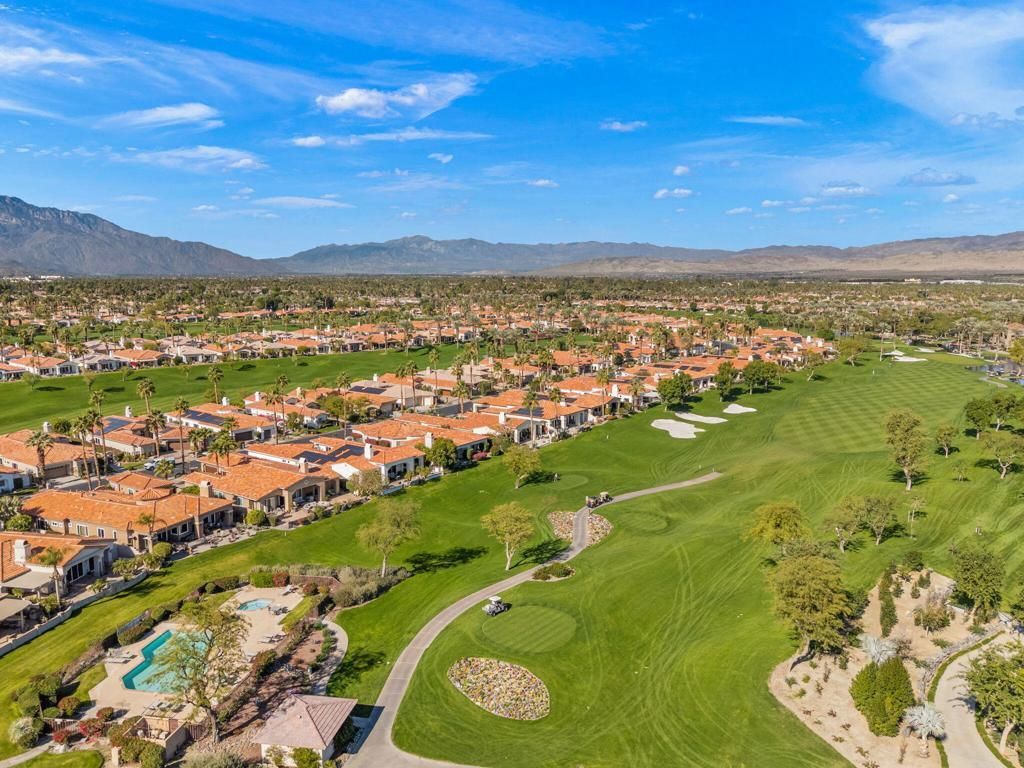 Set on an elevated lot, this sought-after Ocotillo 2 delivers sweeping views across three fairways, the driving range, and dramatic mountain backdrops spanning the Grove and Arroyo courses. Outdoor living shines with a generously sized, elevated patio finished with pavers, a fire pit, and a built-in BBQ perfect for entertaining or simply soaking in the scenery. The popular Ocotillo 2 floor plan features a light-filled great room where the living, dining, and family areas flow seamlessly to the patio, all oriented to capture the incredible views. Custom built-ins enhance both the living and family rooms, while a wet bar overlooks the outdoor living space. A formal dining room sits just off the entry, and the kitchen offers a breakfast bar that opens to the family room for easy entertaining. The primary suite offers a peaceful courtyard outlook and is complete with dual vanities, a soaking tub, a separate shower, and two closets--one a generous walk-in. Two additional ensuite guest rooms are located in the main house, with one currently styled as a home office with custom built-ins. A standout feature is the detached custom casita, privately positioned off the front courtyard. It includes a bedroom, bathroom, compact kitchenette, and its own laundry area ideal for guests or extended stays. Additional highlights include an attached two-car garage plus golf cart garage, furnishings offered per inventory, and a Club Membership available with no wait. Golf membership available per wait list.