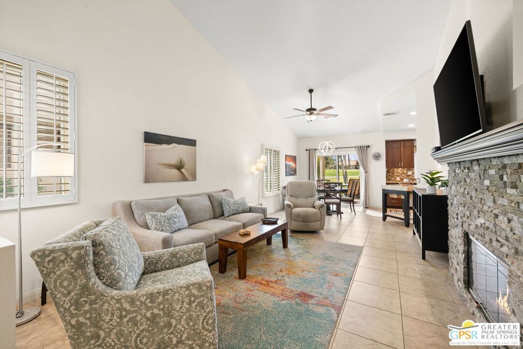 Introducing this beautifully updated and expanded Augusta model, ideally positioned just off the 1st green of a well-maintained 18-hole championship course, offering sweeping mountain, golf course, and clubhouse views. Thoughtfully designed with a cohesive open-concept layout, the great room showcases soaring vaulted ceilings, plantation shutters, custom window treatments, and a striking stacked stone fireplace, flowing seamlessly into an enlarged dining area.The kitchen blends style and functionality with granite countertops, stainless steel appliances, a glass tile backsplash, and soft-close custom cabinetry. It has also been fully upgraded along with all windows and doors throughout the home, enhancing both efficiency and comfort.Both bathrooms have been tastefully remodeled, including a reimagined primary suite bath featuring a walk-in shower. Tile flooring and skylights run throughout, creating a bright, airy atmosphere.Step outside to an extended patio with an Alumawood cover, thoughtfully designed with a raised section to maximize the views, along with electronic drop-down shades which is perfect for entertaining or unwinding while enjoying stunning desert sunsets.Offered tastefully furnished for a seamless move-in experience, this home is complete with an attached garage featuring epoxy flooring. The Palm Desert Resort Country Club has a beautiful clubhouse, Coachella Valley's premier pickleball and tennis club, and an award-winning golf course. The resort is a very active community with a clubhouse (includes formal dining, a lounge, and a pro shop), and 20 pools and spas. This is an exceptional desert retreat combining comfort, quality, and location.