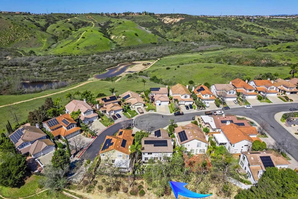 Welcome to this charming, HIGHLY CUSTOMIZED remodeled cul-de-sac home in the sought-after PACIFIC RIDGE neighborhood of Sorrento Valley. SEE DRONE TOUR as this home is Ideally situated adjacent to scenic HIKING/BIKING TRAILS, this light-filled residence offers energy efficiency with OWNED SOLAR. (Current Electric Bill is $0) Step through the double leaded-glass entry doors onto newer hickory hardwood floors. Soaring ceilings and dual-pane windows with custom casings bathe the home in natural light. Added custom features are the mounted TV in living room and refrigerated wine closet. The gourmet kitchen features granite countertops, newer stainless-steel appliances, a cozy breakfast nook and center island with counter seating. The kitchen opens seamlessly to the inviting family room, highlighted by a REBUILT stainless steel wood burning fireplace, newer flue and custom mantel. Designed for indoor-outdoor living, the SOUTH FACING BACKYARD, is an entertainers dream. Enjoy mountain views and sunny afternoons surrounded by lush, easy-care, mature landscaping, redwood planters, and soothing fountains, complete with an above-ground spa and a granite surfaced patio island with grill & stools. The DOWNSTAIRS BEDROOM includes a Murphy bed and is serviced by a beautifully remodeled full bath. Upstairs, the carpeted hardwood staircase leads to the stunning primary suite, where you can greet the MORNING SUNRISE from your bed. The expanded primary bath offers 2 separate granite vanities, custom lighted drawers, hidden medicine chest, large walk-in shower, soaking tub, heated towel rack, heat lamp, multiple windows, and TWO walk-in closets?creating a spa-like retreat. upstairs are 3 more bedrooms?one oversized-ideal as a bonus room/office, plus a remodeled hall bath with dual sinks. The 3-car garage has blue-and-white RACEDECK flooring, abundant storage, overhead racks, 20 AMP charger outlet.