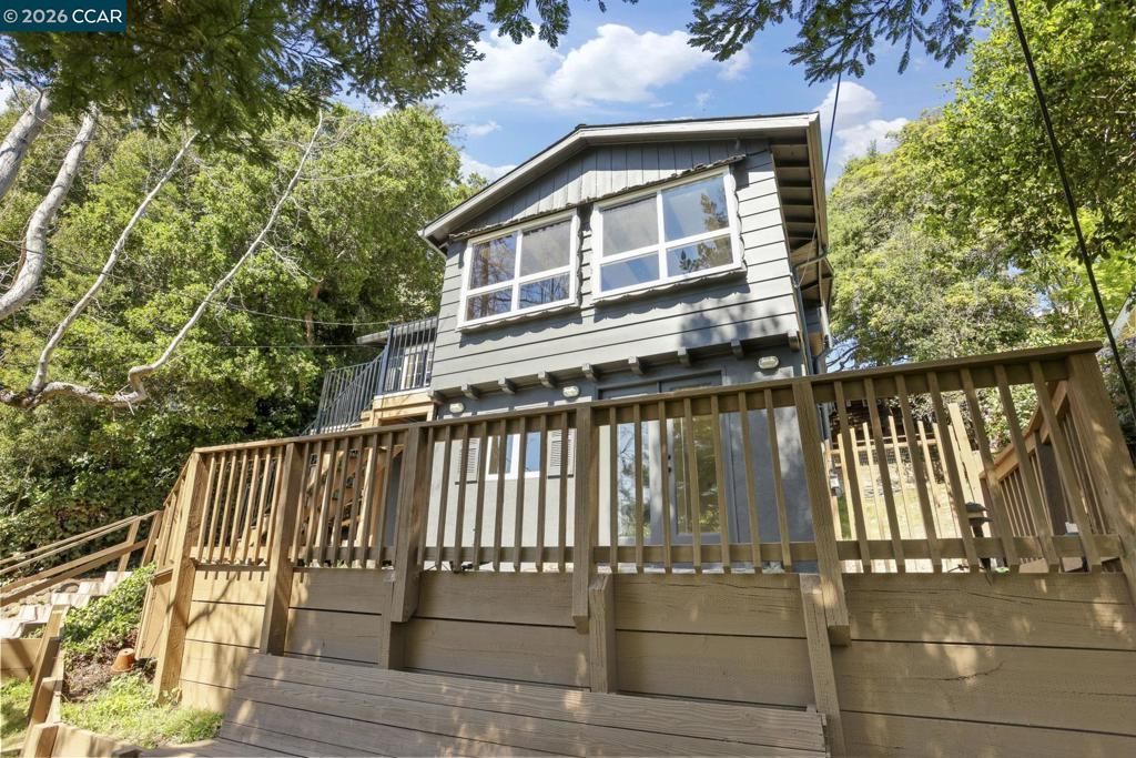 Beautifully updated 1925 cabin-style home, perfectly blending rustic character with modern comfort. The 3 bedroom 1.5 bath main residence is approx. 1,538 sq. ft. and features a welcoming stone fireplace, hardwood floors, wood-framed windows, exposed beam ceilings, and classic paneling?all reflecting the homes original craftsmanship. The remodeled kitchen pairs natural wood cabinetry with upgraded stainless steel appliances, including a gas cooktop, double ovens, built-in microwave, and dishwasher. The lower-level studio (approx. 438 square feet) offers a private entrance, tile floors, a full kitchen, separate bathroom, and versatile living space?ideal for guests or rental income. Nestled among stately oaks, the property embraces nature with stamped concrete walkways, outdoor patios, and filtered views of downtown Oakland. Other outdoor upgrades include a spacious and level concrete terraced yard ideal for entertaining and a new front deck for soaking in the views of natural beauty plus a glimpse of the Bay. A spacious two-car garage/storage unit sits at the top of the lot, adding convenience and functionality. Just minutes from downtown Montclair, with local shops, restaurants, and grocery stores, plus convenient connections to Highway 13 and Highway 24. Open 4/5 2:30-4:00.