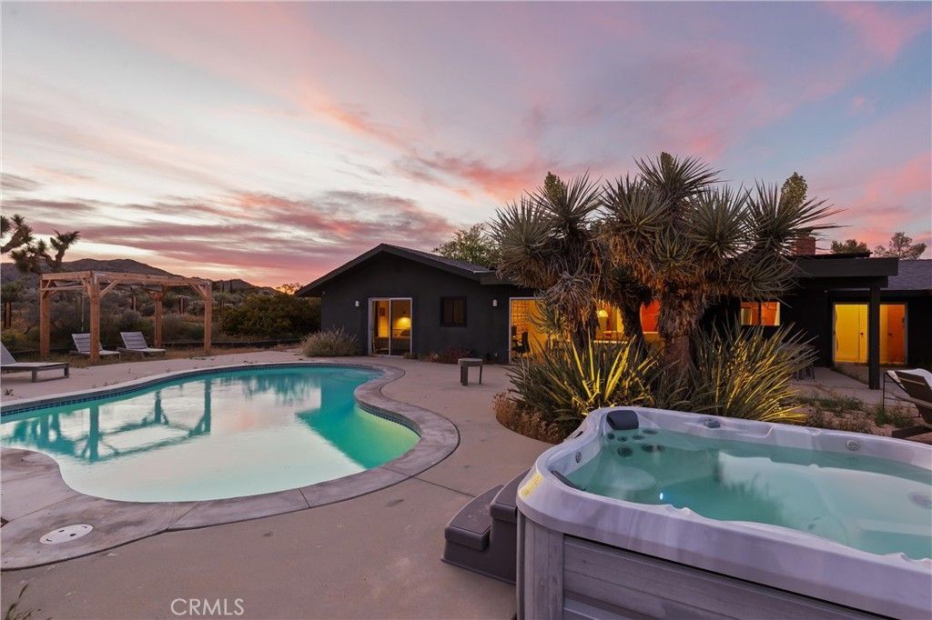 Set on 1.65 acres with unobstructed views toward Joshua Tree National Park, this thoughtfully updated ranch home offers privacy, comfort, and an easy connection to the surrounding desert. Clean, tasteful updates complement the homes original character, including a handmade vintage rock fireplace that anchors the main living space. The spacious kitchen features rich hardwood cabinetry, generous storage, and room to cook, gather, and entertain. The layout includes three bedrooms, two and a half bathrooms, a separate office, an oversized bonus room currently used as a private screening room, and an attached finished studio that could also serve as a workshop or high-finish garage. An owned solar system adds long-term value, and every day efficiency. Outside, mature desert landscaping, sculptural cactus, and established trees create a beautifully grounded setting. The pool and spa sit beneath open skies, while the open land beyond and trail access just past the back gate give the property a rare sense of space and privacy. Set in a great location with easy access to town, the national park, and the best of the area, this is a home that works beautifully as a full-time residence, second home, or standout short-term rental.