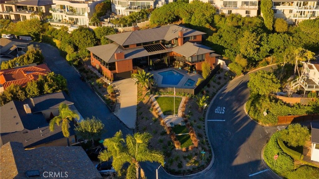 Introducing the Crown Jewel of Mystic Hills, a truly exceptional property cherished by the same family since 1947. Originally built around 1957 and thoughtfully remodeled in 1991, this three-level estate spans nearly 7,000 square feet on a sprawling 17,600-square-foot corner lot at Vista Lane and Mystic Way?one of Laguna Beach's most coveted spots, offering breathtaking 180-degree whitewater ocean views from nearly every room. Enter via a grand deck overlooking the central full-size pool and extra-large spa, enclosed in a private fenced oasis with a gentle coastal breeze. The main level boasts an expansive family room, living area, gourmet kitchen with separate eating nook, formal dining room, and formal living room?accented by two large fireplaces. A luxurious main-floor master suite features a walk-in closet, en suite bath with Jacuzzi tub and separate shower, its own fireplace, and direct pool access. Ascend to the upper level mezzanine with a fireplace, office area, and panoramic ocean vistas, plus a viewing deck for sunset watching. Two master-sized bedrooms await: one with a private rear deck, the other with ocean views and a fireplace. They share a Jack-and-Jill bath boasting a Jacuzzi tub, separate shower, and dual sinks. The lower level includes an extra-large bedroom with en suite bath, plus a separate ADU-like fifth bedroom with galley kitchen (stove, cooktop, dishwasher, sink, fridge) and en suite bath?ideal for guests or multigenerational living. A two-car garage and long driveway provide ample parking. Outside, enjoy a gazebo, fruit orchard, and a dramatic corner promontory pointe at the corner intersection?forming a private park-like grassy area with bench seating perfect for watching serene sunsets. With five fireplaces total, walking distance to the beach, high school, and downtown, and potential for subdivision or additional ADU, this rare gem blends history, luxury, and endless possibilities. Don't miss this unparalleled opportunity!