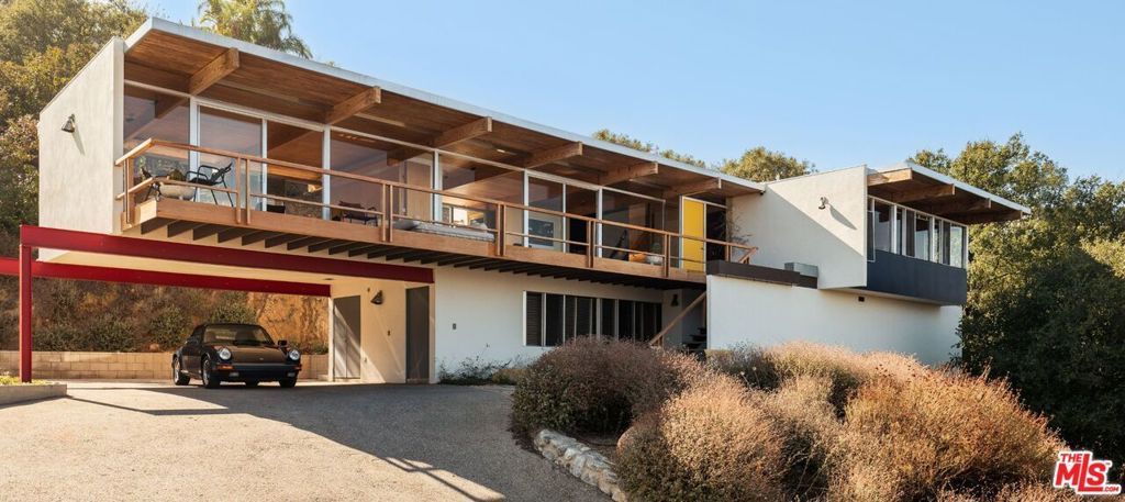 A flawless restoration of Richard Neutra, FAIA :: The Linn Residence, 1961. Sits on a secluded promontory perched, above the legendary Mulholland Drive in the Hollywood Hills, with explosive views of the Valley and the San Gabriel Mountain range. Neutra lifts the main level above the site and over the carport and a separate guest quarters to further enhance the views. This second level consists of a living area divided by a hearth, newly restored kitchen, ensuite primary with bath, guest bath, two bedrooms separated by a collapsible wall, and the red room sauna. The grounds include terraces, decks, private pool, and gated drive. Absolutely everything impeccably restored.